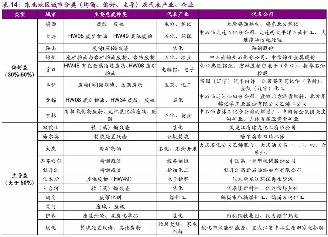 東北地區(qū)無(wú)均衡型城市,整體產(chǎn)業(yè)分為:1)石化、化工,如大連、阜新、盤錦、吉林、大慶等;2)煤、鋼產(chǎn)業(yè),如雞西、鞍山、雙鴨山、本溪、七臺(tái)河、伊春等。產(chǎn)廢量占所在城市產(chǎn)廢量比例較大的企業(yè)有:雙鴨山黑龍江省建龍化工有限公司(90%)、齊齊哈爾中國(guó)第一重型機(jī)械股份公司(72%)、鞍山鞍鋼股份有限公司(95%)、葫蘆島中冶葫蘆島有色金屬有限公司(68%)、吉林中石油吉林石化分公司丙烯腈廠(57%)等。