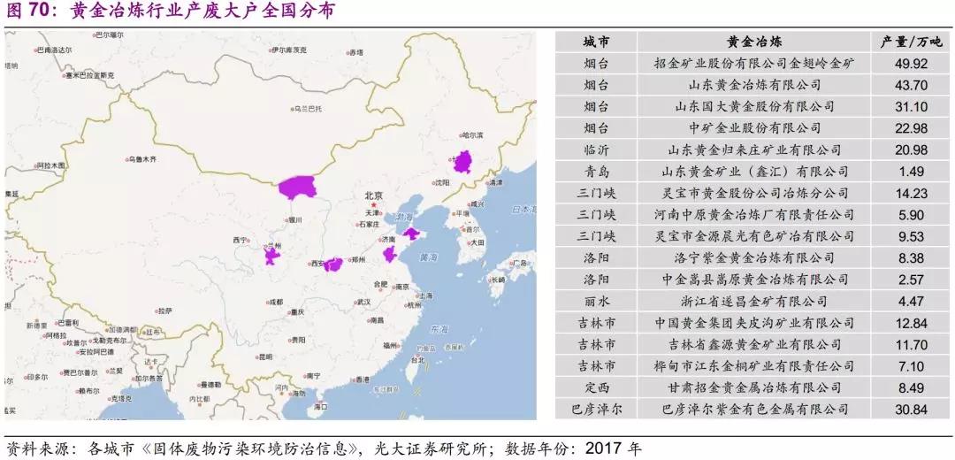 我國(guó)黃金冶煉行業(yè)產(chǎn)廢大戶主要分布于山東、河南、吉林三省,內(nèi)蒙古及甘肅亦有少量分布。其中山東省以煙臺(tái)為中心,煙臺(tái)市2017年工業(yè)危險(xiǎn)廢物產(chǎn)生量10萬(wàn)噸以上企業(yè)6家,其中五家為黃金冶煉行業(yè),分別為招金礦業(yè)股份有限公司金翅嶺金礦(50萬(wàn)噸)、山東黃金冶煉有限公司(44萬(wàn)噸)、山東國(guó)大黃金股份有限公司(31萬(wàn)噸)、中礦金業(yè)股份有限公司(23萬(wàn)噸)、山東恒邦冶煉股份有限公司(19萬(wàn)噸),主要危險(xiǎn)廢物為黃金冶煉氰化尾渣。
