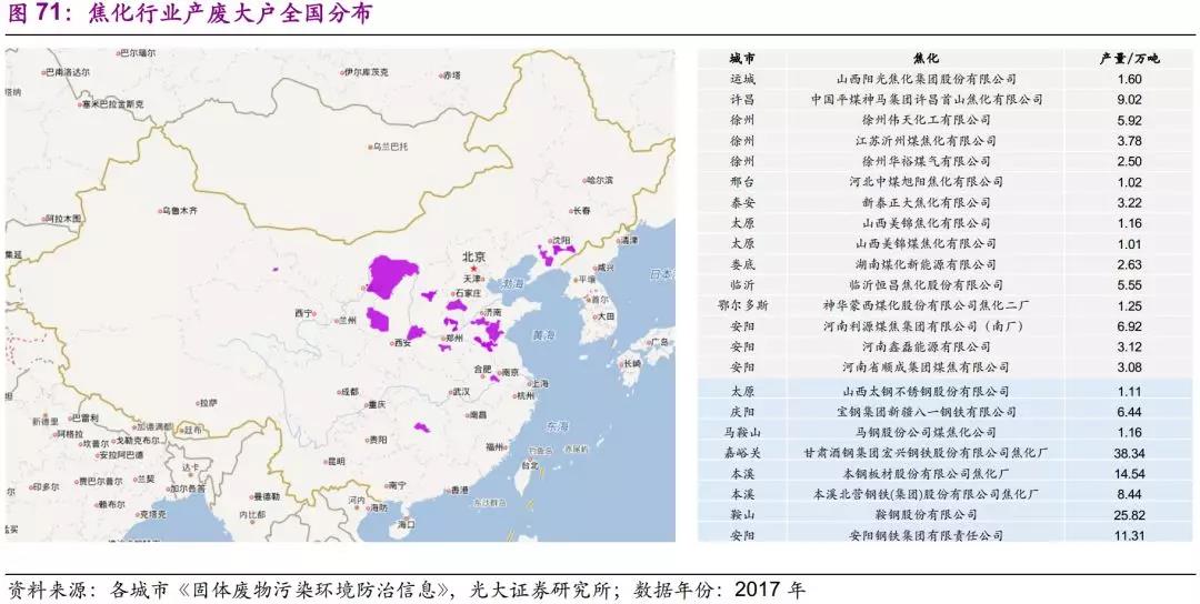 我國(guó)焦化行業(yè)產(chǎn)廢大戶主要分布于華北地區(qū),可分為兩類:一是獨(dú)立焦化企業(yè),主要分布于山東、山西等地,如中國(guó)平煤神馬集團(tuán)許昌首山焦化有限公司(9萬(wàn)噸)、河北中煤旭陽(yáng)焦化有限公司(1萬(wàn)噸)等;二是鋼鐵企業(yè)自建焦化廠,主要分布于本溪、鞍山、安陽(yáng)等地,如本鋼板材股份有限公司焦化廠(15萬(wàn)噸)、鞍鋼股份有限公司(26萬(wàn)噸)、安陽(yáng)鋼鐵集團(tuán)有限責(zé)任公司(11萬(wàn)噸)等。整體來(lái)看,鋼鐵企業(yè)自建焦化廠規(guī)模大于獨(dú)立焦化廠。