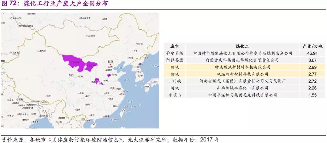 煤化工行業(yè)主要分布于內(nèi)蒙古、山東、河南等地??傮w來(lái)看,行業(yè)分布較為集中,且規(guī)模較小。除中國(guó)神華煤制油化工有限公司鄂爾多斯煤制油分公司(47萬(wàn)噸)以外,其余企業(yè)年危廢產(chǎn)量均在10萬(wàn)噸以下。
