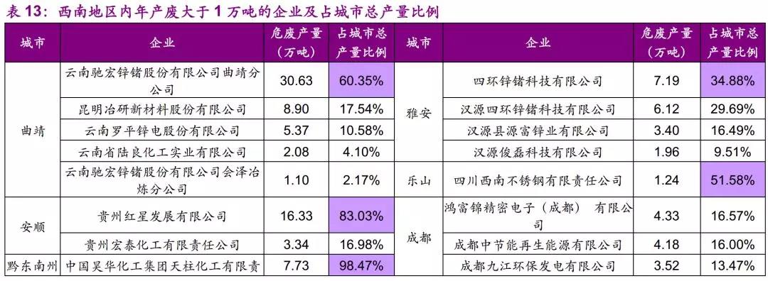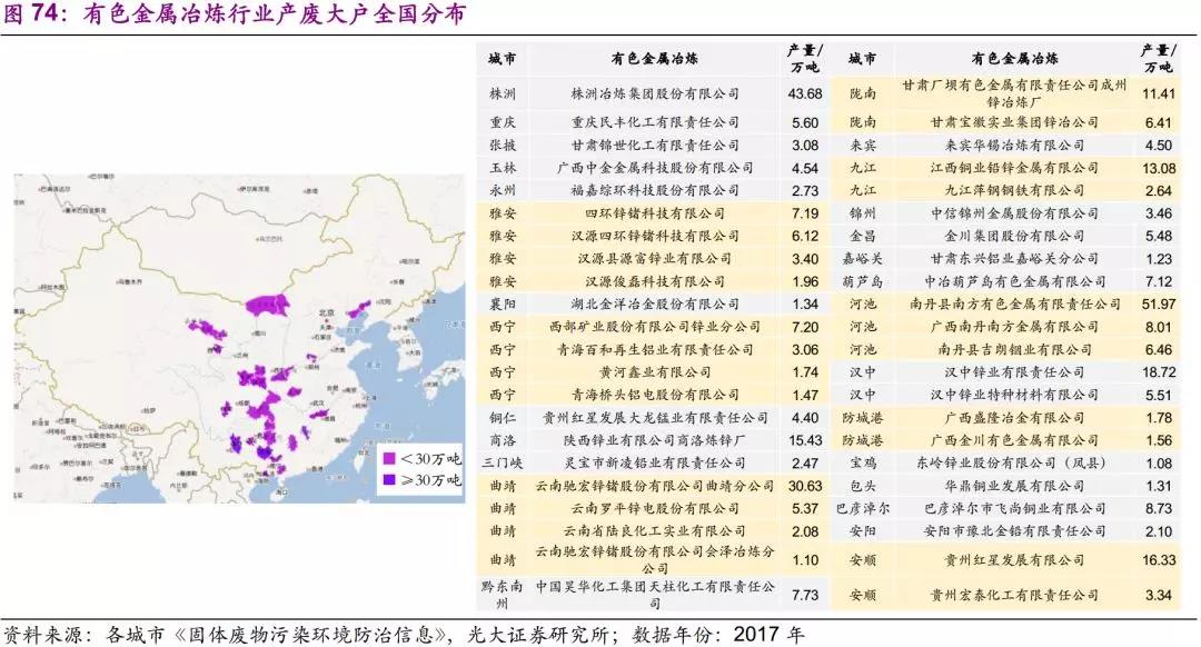 有色金屬冶煉大戶主要分布于西部地區(qū)。從湖南、貴州、廣西、云南、四川到陜西、甘肅、內(nèi)蒙古均有廣泛分布。其中產(chǎn)廢量較大的企業(yè)有株洲冶煉集團(tuán)股份有限公司(44萬(wàn)噸)、陜西鋅業(yè)有限公司商洛煉鋅廠(15萬(wàn)噸)、云南馳宏鋅鍺股份有限公司曲靖分公司(31萬(wàn)噸)、南丹縣南方有色金屬有限責(zé)任公司(52萬(wàn)噸)、漢中鋅業(yè)有限責(zé)任公司(19萬(wàn)噸)、貴州紅星發(fā)展有限公司(16萬(wàn)噸)。在雅安、安順、銅仁、曲靖等城市,有色金屬冶煉行業(yè)占據(jù)主導(dǎo)地位。