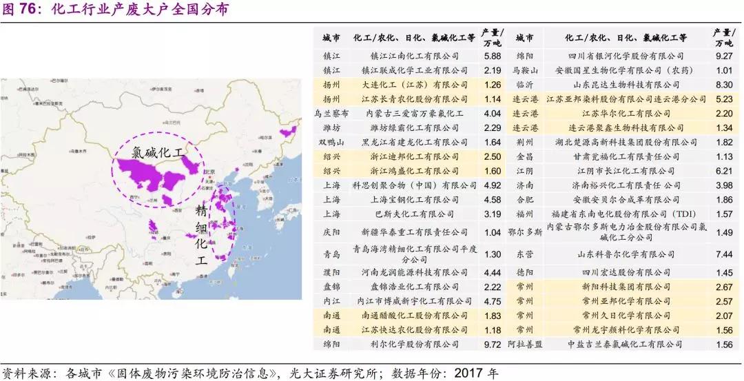 整體來(lái)看,化工行業(yè)主要分布于東部沿海和西北地區(qū)。按照主要產(chǎn)業(yè)的區(qū)別,我們將其分類為東部精細(xì)化工區(qū)和西部氯堿化工區(qū)。前者代表企業(yè)為揚(yáng)州江蘇長(zhǎng)青農(nóng)化股份有限公司(1萬(wàn)噸)、上海巴斯夫化工有限公司(3萬(wàn)噸)等,主要危廢種類為蒸餾(精餾)殘?jiān)?、染料廢物等;后者代表企業(yè)有阿拉善盟中鹽吉蘭泰氯堿化工有限公司(2萬(wàn)噸)、鄂爾多斯內(nèi)蒙古鄂爾多斯電力冶金股份有限公司氯堿化工分公司(1萬(wàn)噸)等,主要危廢種類為廢催化劑、廢堿等。