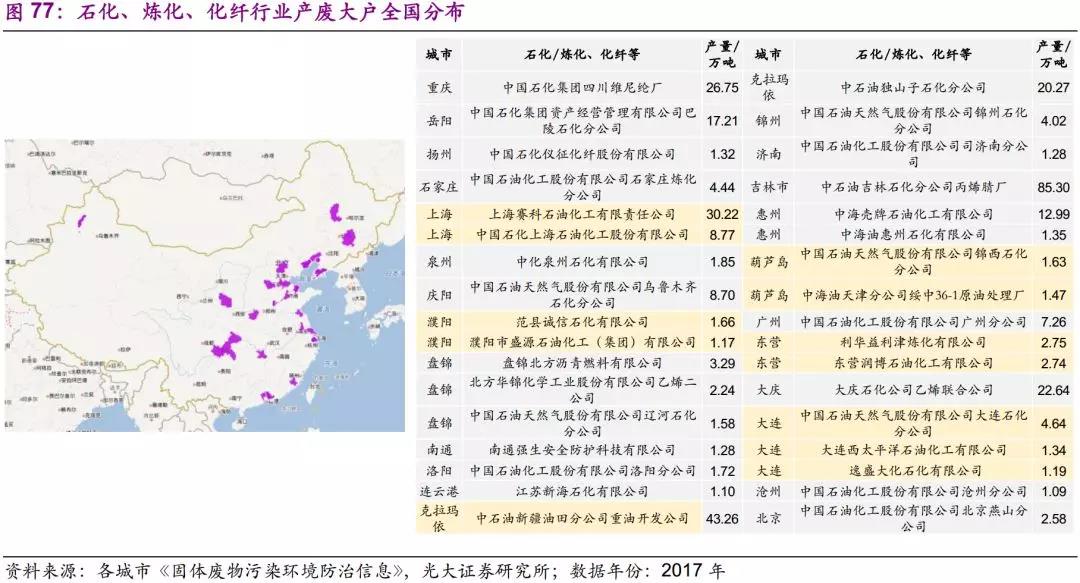煉化企業(yè)主要分布于東北、山東、江蘇、川渝等地,基本上是中石油、中石化分公司。產(chǎn)廢量較大的企業(yè)有中國(guó)石化集團(tuán)四川維尼綸廠(27萬(wàn)噸)、上海賽科石油化工有限責(zé)任公司(30萬(wàn)噸)、中石油新疆油田分公司重油開發(fā)公司(43萬(wàn)噸)、中石油吉林石化分公司丙烯腈廠(85萬(wàn)噸)。