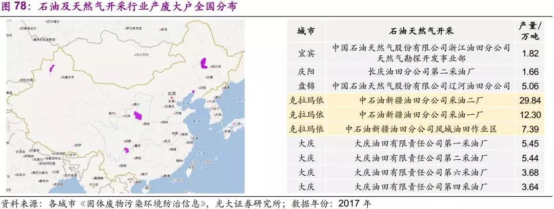 石油及天然氣開采行業(yè)主要分布于我國(guó)幾大油田,如長(zhǎng)慶油田、大慶油田、克拉瑪依油田、遼河油田等。另外,隨著頁(yè)巖氣開發(fā)逐步推進(jìn),川渝地區(qū)也將成為成為油田危廢的重要產(chǎn)地,2017年宜賓市中石油天然氣勘探開發(fā)事業(yè)部產(chǎn)生危廢1.8萬(wàn)噸。而克拉瑪依中石油新疆油田第一、二采油廠及鳳城油田作業(yè)區(qū)共產(chǎn)生危廢近50萬(wàn)噸,遠(yuǎn)超其他油田產(chǎn)量。