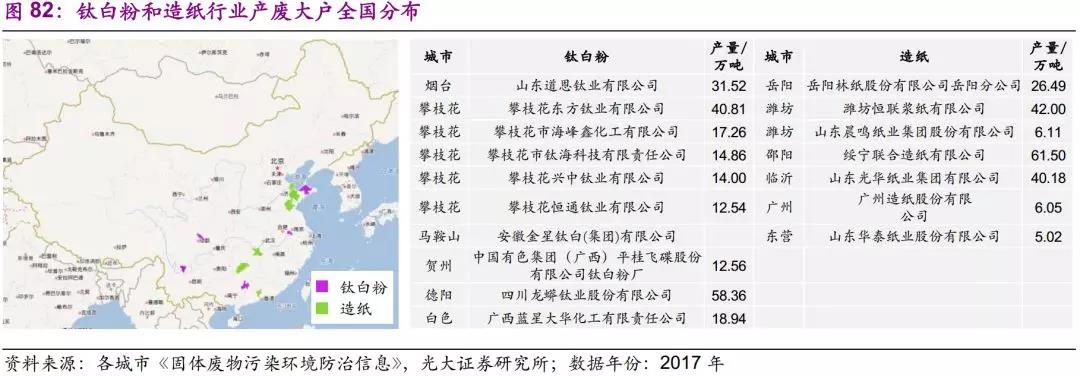 鈦白粉和造紙?jiān)旒埿袠I(yè)分布較為集中。其中攀枝花作為鈦白粉產(chǎn)業(yè)集中地,每年僅廢酸產(chǎn)量就達(dá)120萬(wàn)噸,2017年產(chǎn)廢量前5位均為鈦白粉生產(chǎn)企業(yè),分別是攀枝花東方鈦業(yè)有限公司(41萬(wàn)噸)、攀枝花市海峰鑫化工有限公司(17萬(wàn)噸)、攀枝花市鈦??萍加邢挢?zé)任公司(15萬(wàn)噸)、攀枝花興中鈦業(yè)有限公司(14萬(wàn)噸)、攀枝花恒通鈦業(yè)有限公司(13萬(wàn)噸)。造紙企業(yè)產(chǎn)廢大戶則主要分布于山東、湖南兩省,主要有邵陽(yáng)綏寧聯(lián)合造紙有限公司(62)萬(wàn)噸、濰坊濰坊恒聯(lián)漿紙有限公司(42萬(wàn)噸)、臨沂山東光華紙業(yè)集團(tuán)有限公司(40萬(wàn)噸)等。