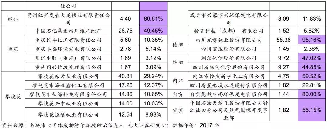西南地區(qū)以主導(dǎo)型城市為主,多數(shù)城市產(chǎn)廢量較小,且種類單一。主要產(chǎn)業(yè)有:1)有色金屬冶煉,如曲靖、銅仁、怒江、雅安、安順;2)鈦白粉產(chǎn)業(yè),如攀枝花、德陽(yáng)。產(chǎn)廢量占所在城市產(chǎn)廢量比例較大的企業(yè)有:曲靖云南馳宏鋅鍺股份有限公司曲靖分公司(60%)、安順貴州紅星發(fā)展有限公司(83%)、黔東南州中國(guó)昊華化工集團(tuán)天柱化工有限責(zé)任公司(98%)、銅仁貴州紅星發(fā)展大龍錳業(yè)有限責(zé)任公司(87%)、德陽(yáng)四川龍蟒鈦業(yè)股份有限公司(95%)。