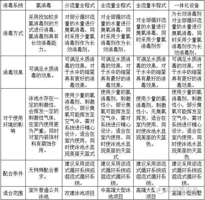 游泳池水處理系統(tǒng)的一個重要組成部分是消毒系統(tǒng),常用的消毒系統(tǒng)有氯消毒系統(tǒng)、臭氧消毒系統(tǒng)等。其中臭氧消毒系統(tǒng)從消毒量來分有全流量臭氧消毒系統(tǒng)和分流量臭氧消毒系統(tǒng)兩大系列;從消毒流程來分有全程式及半程式兩種;同時,為了適應(yīng)新的發(fā)展,目前出現(xiàn)了一種一體化臭氧消毒設(shè)備。這些消毒系統(tǒng)的特點具體見下表: