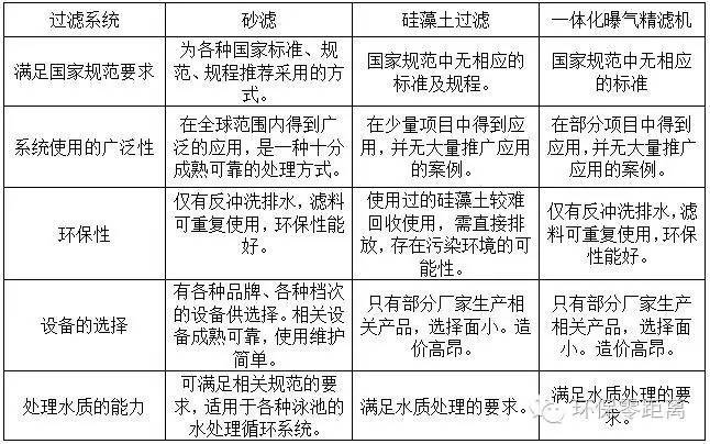 泳池過濾系統(tǒng)為循環(huán)處理系統(tǒng)的重要組成部分,該系統(tǒng)的選擇直接影響著游泳池水處理系統(tǒng)是否滿足使用要求。現(xiàn)在的過濾系統(tǒng)有砂濾、硅藻土過濾、一體化曝氣精濾機等,他們各有特點,具體的分析見下表。