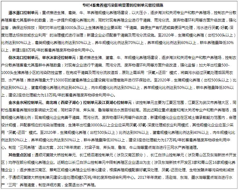 優(yōu)化畜禽及水產(chǎn)養(yǎng)殖布局。2017年前,依法關(guān)閉或搬遷禁養(yǎng)區(qū)內(nèi)的畜禽養(yǎng)殖場(小區(qū))和養(yǎng)殖專業(yè)戶,對四環(huán)線公路以外的未達(dá)標(biāo)小型養(yǎng)殖小區(qū)按照規(guī)模標(biāo)準(zhǔn)實施改造升級,不再擴(kuò)大限制發(fā)展區(qū)養(yǎng)殖規(guī)模,同時做好糞污資源化利用和處理。2018年底前,限制養(yǎng)殖區(qū)規(guī)模以下養(yǎng)殖場全部退出,規(guī)模以上畜禽養(yǎng)殖場(小區(qū))須實現(xiàn)糞污資源化利用,達(dá)到環(huán)保要求;未達(dá)到環(huán)保要求的,依法責(zé)令停止生產(chǎn)或者使用,并處以罰款。鼓勵適宜養(yǎng)殖區(qū)內(nèi)散養(yǎng)戶逐步退出,支持發(fā)展高標(biāo)準(zhǔn)、現(xiàn)代化的畜禽養(yǎng)殖場(小區(qū)),實現(xiàn)畜禽養(yǎng)殖退養(yǎng)平衡。逐步退出水產(chǎn)“三網(wǎng)”養(yǎng)殖。2017年1月底前,拆除梁子湖、湯遜湖、東湖、斧頭湖等重點湖泊的漁業(yè)“三網(wǎng)”設(shè)施;2017年12月底前,完成全市湖泊保護(hù)目錄中湖泊的漁業(yè)“三網(wǎng)”設(shè)施拆除。開展?jié)O業(yè)禁養(yǎng)區(qū)劃分,優(yōu)化水產(chǎn)養(yǎng)殖空間布局。中心城區(qū)40個湖泊列入漁業(yè)禁止養(yǎng)殖區(qū),不得開展經(jīng)營性水產(chǎn)養(yǎng)殖;其他126個湖泊由各轄區(qū)人民政府確定禁、限養(yǎng)殖分類,原則上列入漁業(yè)限制養(yǎng)殖區(qū),對列入限制養(yǎng)殖區(qū)的由各區(qū)人民政府依據(jù)湖泊水質(zhì)狀況制定養(yǎng)殖水域、面積、種類、密度等養(yǎng)殖規(guī)范,實行不投肥、不投藥、不投飼的生態(tài)養(yǎng)殖模式。到2020年,禁養(yǎng)區(qū)內(nèi)全部畜禽養(yǎng)殖及水產(chǎn)養(yǎng)殖企業(yè)退出;限養(yǎng)區(qū)內(nèi)規(guī)模以下畜禽養(yǎng)殖企業(yè)退出,完成水產(chǎn)禁、限養(yǎng)殖區(qū)域劃分,退出全部湖庫禁養(yǎng)區(qū)內(nèi)水產(chǎn)養(yǎng)殖,其他區(qū)域內(nèi)實施水產(chǎn)生態(tài)養(yǎng)殖改造。