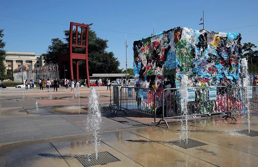 配圖:工作組會(huì)議期間,日內(nèi)瓦萬(wàn)國(guó)宮外的塑料垃圾“立方”,提醒人們塑料垃圾問(wèn)題的嚴(yán)重性。