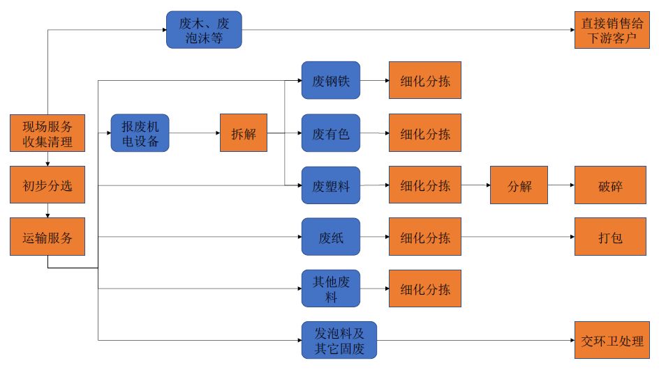 根據(jù)中再環(huán)服與供應商的合作約定,中再環(huán)服派業(yè)務人員駐扎在供應商廠區(qū),在現(xiàn)場進行廢料的初步分揀,現(xiàn)場分揀出的廢泡沫、廢木頭等直接銷售給下游客戶,其余廢料拉回倉儲地,做進一步的深度分揀處理。