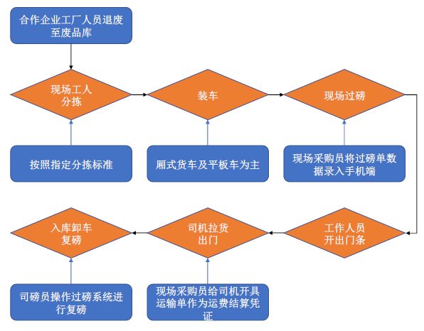 中再環(huán)服根據(jù)供應商要求的不同,分別采取參與投標或協(xié)商談判的方式與之簽訂回收合同或框架協(xié)議。中再環(huán)服采用預付款的形式支付采購款項,預估月采購金額提前支付半個月或一個月的預付款,在收到供應商預付款補充通知后及時補足預付款項。具體回收流程如下: