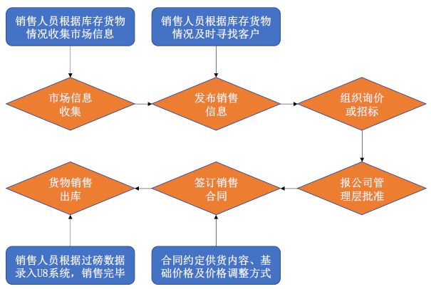 由中再環(huán)服銷售部負責組織實施銷售業(yè)務,中再環(huán)服銷售部首先通過信息收集,了解同類產(chǎn)品的市場價格。其次,通過經(jīng)常性業(yè)務往來,中再環(huán)服與客戶建立了長期穩(wěn)定的合作關系,中再環(huán)服通過與客戶簽訂年度合作框架協(xié)議約定基準價格和價格調(diào)整方式,或者銷售人員根據(jù)庫存貨物情況及時尋找客戶進行詢價或組織競標;經(jīng)管理層批準后,銷售部與客戶簽訂銷售合同。具體的銷售流程圖如下: