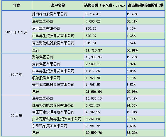 3、和大型知名企業(yè)的合作協(xié)議都簽到了2021年,穩(wěn)定性肯定沒問題:“中再環(huán)服與海爾集團、格力電器、東風汽車均維持多年合作關系,歌爾股份雖為2017年新增客戶,但雙方已簽訂了截至2021年的長期合同,各大供應商均對中再環(huán)服有較高的認可度。因此,中再環(huán)服與上述大型企業(yè)建立的合作關系是可持續(xù)的?!?/p>