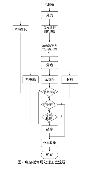 電路板的處理可采用破碎、分選、火法或濕法冶金等技術(shù),電路板常用處理工藝流程如圖所示。