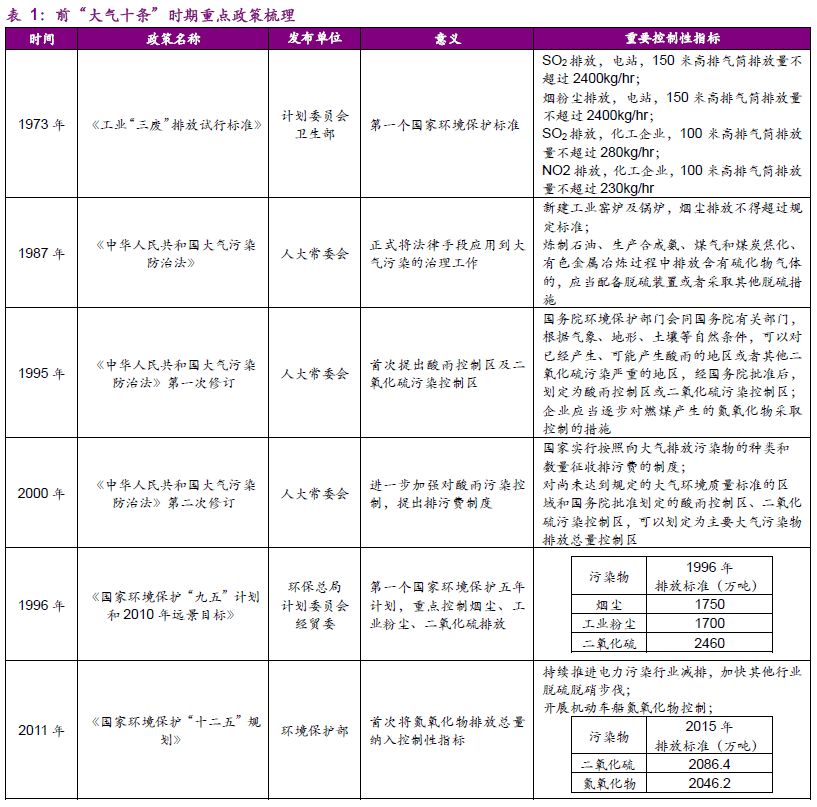 ◆路線之變——大氣治理半世紀(jì)。我國的大氣污染防治起步于1970年,從彼時的“酸雨之殤”,到現(xiàn)在的“穹頂之下”,我國的大氣污染治理路線經(jīng)歷了“控制酸雨”—“大氣十條”—“藍(lán)天保衛(wèi)戰(zhàn)”的發(fā)展,治理措施從火電脫硫到火電脫硝除塵、再到其他行業(yè)限產(chǎn)、直至當(dāng)前的非電提標(biāo)改造,污染物防治也從單一的二氧化硫擴展到五大空氣污染物全面控制,治理手段豐富,技術(shù)先進(jìn),范圍全面,我國大氣污染防治三十年間實現(xiàn)了快速發(fā)展。