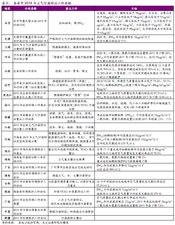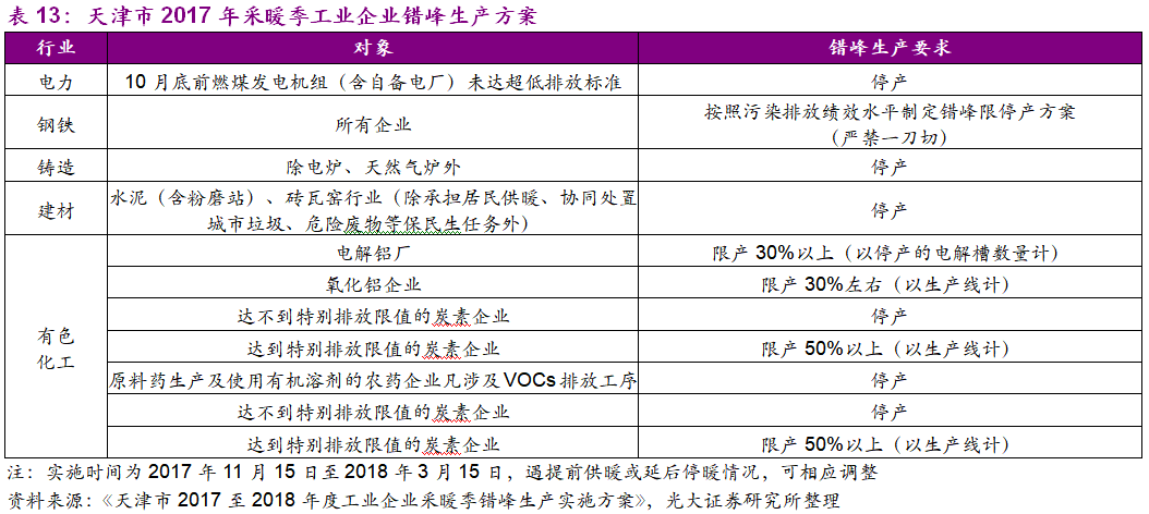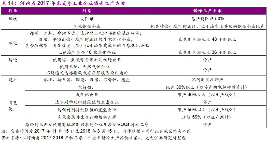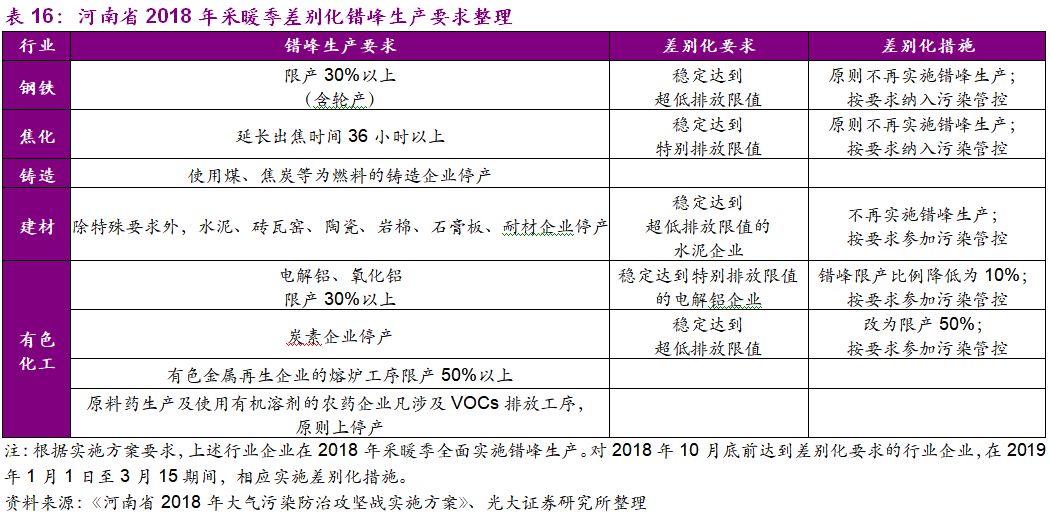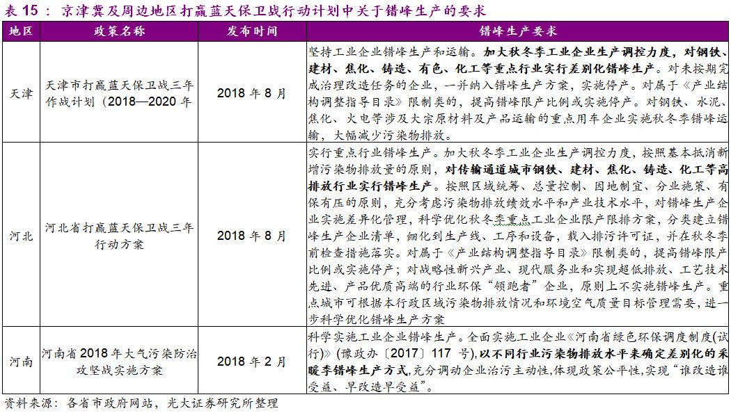 在《京津冀及周邊地區(qū)2018-2019年秋冬季大氣污染綜合治理攻堅行動方案》正式發(fā)布之前,天津、河北、河南等省市已提前發(fā)布了各自打贏藍(lán)天保衛(wèi)戰(zhàn)的行動方案,其中亦對錯峰生產(chǎn)的原則性要求做了規(guī)定。未來各省市仍將出臺針對性的錯峰生產(chǎn)方案,具體限產(chǎn)要求有待進(jìn)一步觀察。
