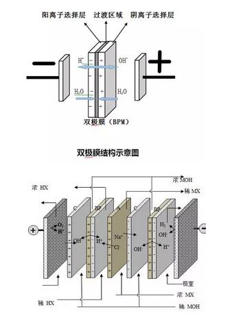 雙極膜亦稱(chēng)雙極性膜,是特種離子交換膜,它是由一張陽(yáng)膜和一張陰膜復(fù)合制成的陰、陽(yáng)復(fù)合膜。該膜的特點(diǎn)是在直流電場(chǎng)的作用下,陰、陽(yáng)膜復(fù)合層間的H2O解離成H+和OH-并分別通過(guò)陰膜和陽(yáng)膜,作為H+和OH-離子源。在水處理中主要通過(guò)離子交換達(dá)到凈化水資源的目的。