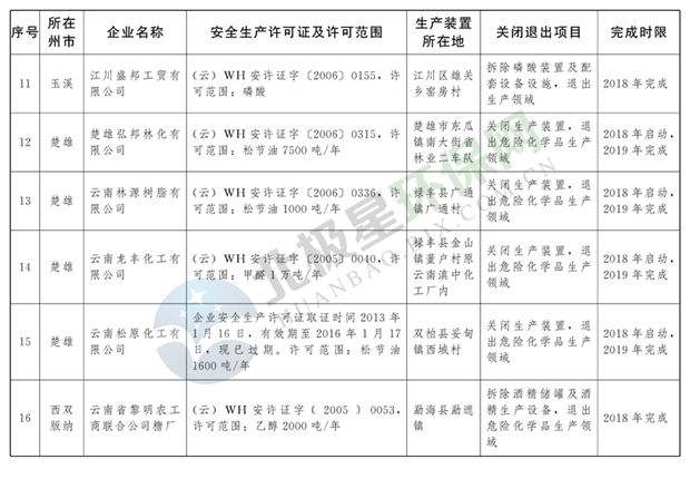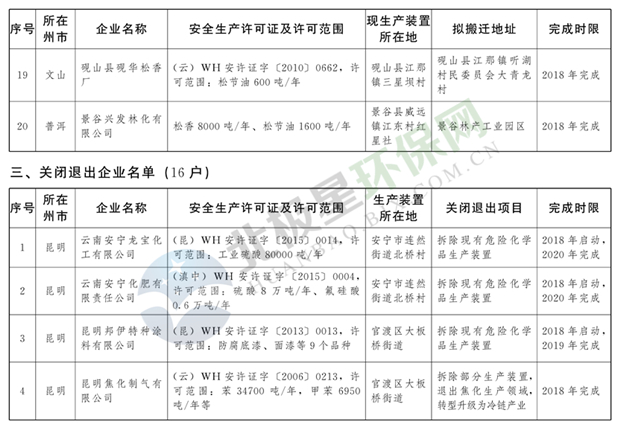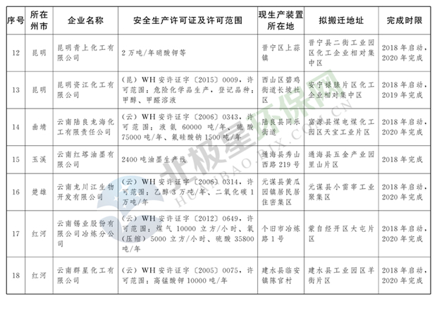 日前云南省人民政府發(fā)布了《云南省城鎮(zhèn)人口密集區(qū)危險(xiǎn)化學(xué)品生產(chǎn)企業(yè)搬遷改造名單》,其中就地改造企業(yè)6戶,搬遷入園企業(yè)20戶,關(guān)閉退出企業(yè)16戶,具體名單見(jiàn)正文: