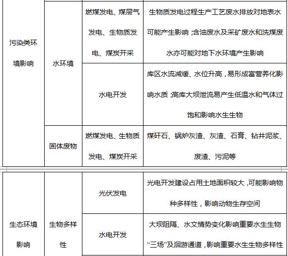 4、生態(tài)環(huán)境影響:煤礦開采造成采空塌陷區(qū),導致土壤龜裂,山體滑坡,水資源流失,耕地毀壞;光電開發(fā)占用土地面積較大,影響動物生存空間,對物種多樣性有一定影響;水電開發(fā)造成水文情勢變化,影響水生生物“三場”及洄游通道,影響水生生物多樣性;風電開發(fā)風機可能對鳥類的覓食、休憩和遷飛等活動行為產(chǎn)生一定的不利影響。