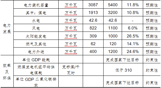 能源能效水平進(jìn)一步提升。單位GDP能耗完成國(guó)家下達(dá)目標(biāo)。燃煤發(fā)電機(jī)組平均供電煤耗低于310克標(biāo)煤/千瓦時(shí),其中新建煤電機(jī)組平均供電煤耗低于300克標(biāo)煤/千瓦時(shí);單位GDP二氧化碳排放完成國(guó)家下達(dá)目標(biāo),二氧化硫、氮氧化物及煙塵排放控制在國(guó)家下達(dá)目標(biāo)之內(nèi)。