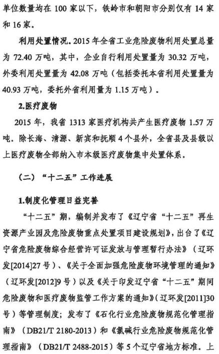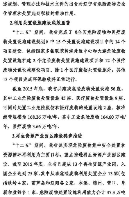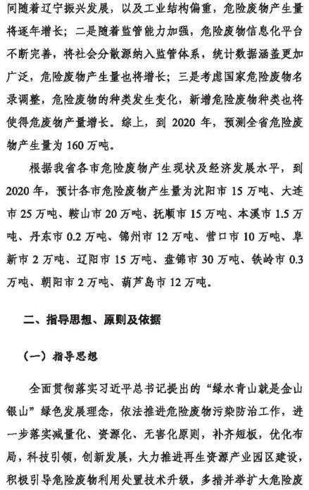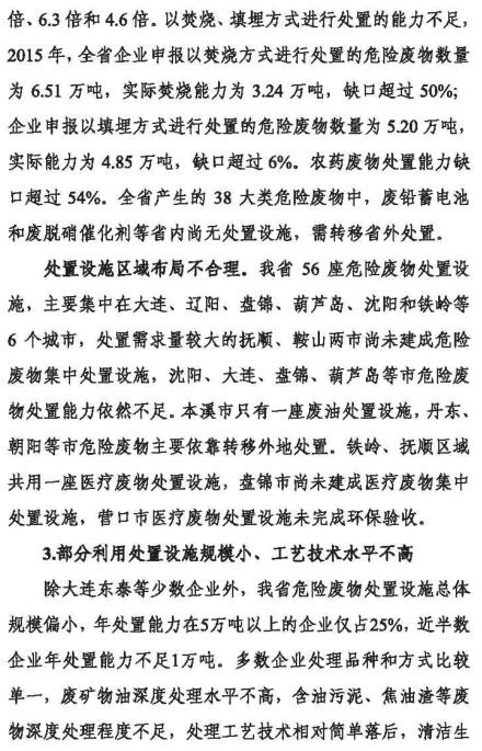 日前,遼寧環(huán)保廳公布了《遼寧省“十三五”危險(xiǎn)廢物污染防治規(guī)劃》,預(yù)計(jì)“十三五”期間危險(xiǎn)廢物利用處置設(shè)施建設(shè)資金投入達(dá)20億元以上,全省新增危險(xiǎn)廢物處置能力50萬噸以上,全省危險(xiǎn)廢物利用處置總能力達(dá)220萬噸,基本滿足全省危險(xiǎn)廢物利用處置需求。