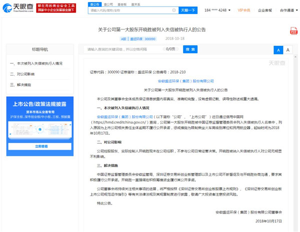 盛運(yùn)環(huán)保:公司第一大股東開曉勝被列入失信被執(zhí)行人
