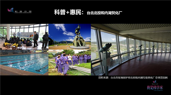 這是在臺北建設的北投和內湖垃圾焚燒廠,這里有環(huán)境教育教室,有游泳池為周邊的居民和周邊的中小學提供免費的游泳服務,有建立在煙囪頂部的旋轉餐廳。如果垃圾焚燒廠煙囪里面有污染物質超標排放,那么餐廳這個位置應該是最容易受到污染的,而事實上排放是達標的。大家可以在這里用餐、休息、觀景,沒有安全的隱患。