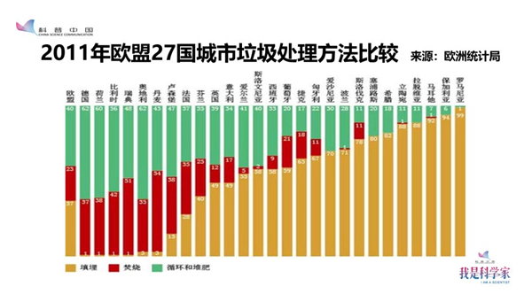 通常來說垃圾有三種處理方式:資源的循環(huán)再利用,垃圾的衛(wèi)生填埋和垃圾的焚燒發(fā)電。通過這張圖,我們可以分析得出一個結論:歐盟國家中經濟生活水平比較低的國家,最主要的處理方式是填埋。
