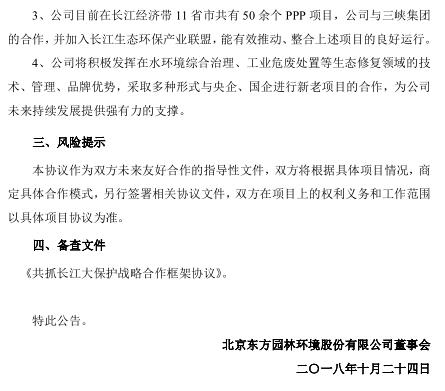 10月24日,東方園林公告,公司與長江三峽集團簽訂《共抓長江大保護戰(zhàn)略合作框架協(xié)議》,雙方將通過多種合作模式,推動長江經(jīng)濟帶綠色產(chǎn)業(yè)經(jīng)濟運營合作;目前東方園林在長江經(jīng)濟帶11省市共有50余個PPP項目,與三峽集團合作,并加入長江生態(tài)環(huán)保產(chǎn)業(yè)聯(lián)盟,能有效推動這些項目的良好運行。
