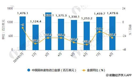 在進(jìn)口金額方面,2018年3-6月中國固體廢物進(jìn)口金額呈下降趨勢,2018年6月中國固體廢物進(jìn)口金額為1253百萬美元,同比下降38.3%。2018年7-8月中國固體廢物進(jìn)口金額有所回升,2018年8月中國固體廢物進(jìn)口金額為1480百萬美元,同比下降26.3%。