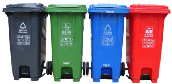 (其他垃圾:灰色,餐廚垃圾:綠色,可回收物:藍色,有害垃圾:紅色,鼓勵使用帶腳踏收集容器,方便市民投放)