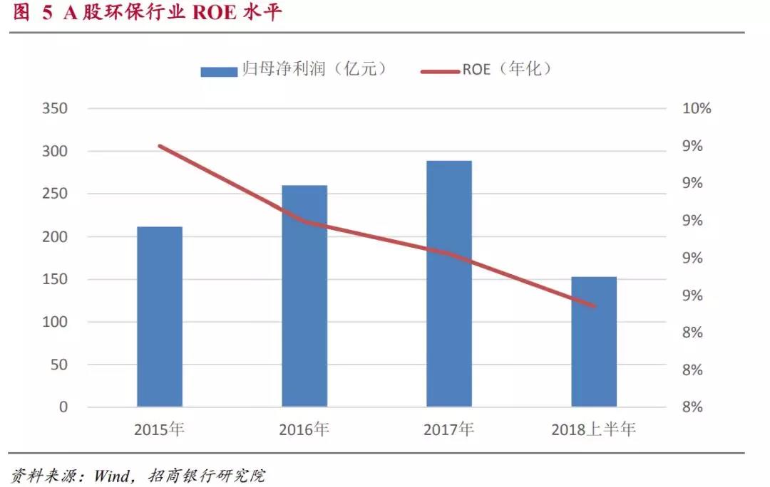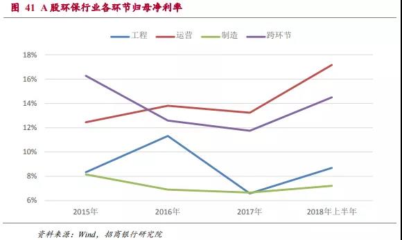 2015年到2017年環(huán)保類上市公司的ROE分別為9.4%、9.0%和8.3%,有逐年下降的趨勢(由于環(huán)保工程類項目大多數(shù)結算集中于下半年,2018年上半年年化以后的ROE水平明顯略低屬于正常情況)。在后文的分析中可以看出行業(yè)ROE水平的下降主要是受到運營和制造環(huán)節(jié)ROE下滑的影響。2018年上半年這兩個領域的ROE水平已經(jīng)開始回升,因此整體行業(yè)ROE下滑的趨勢可能會改變。