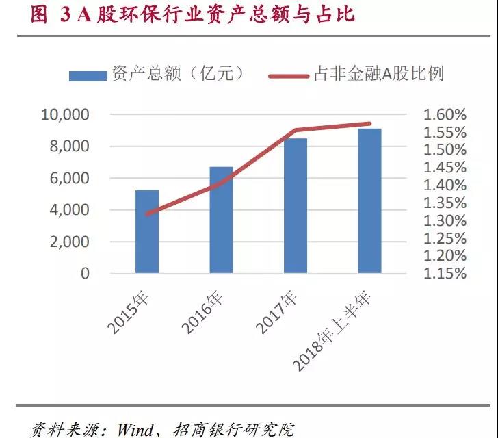 上市公司中,環(huán)保行業(yè)資產(chǎn)呈現(xiàn)逐步增長的趨勢。從2015年底到2018年上半年,環(huán)保行業(yè)A股上市公司的資產(chǎn)總額從5231億增加到9124億,年復合增長率為24.9%,快于A股總體資產(chǎn)的增長。本行業(yè)資產(chǎn)占A股總資產(chǎn)的比重從2015年年底的1.32%,上升到2018年的年中的1.57%。