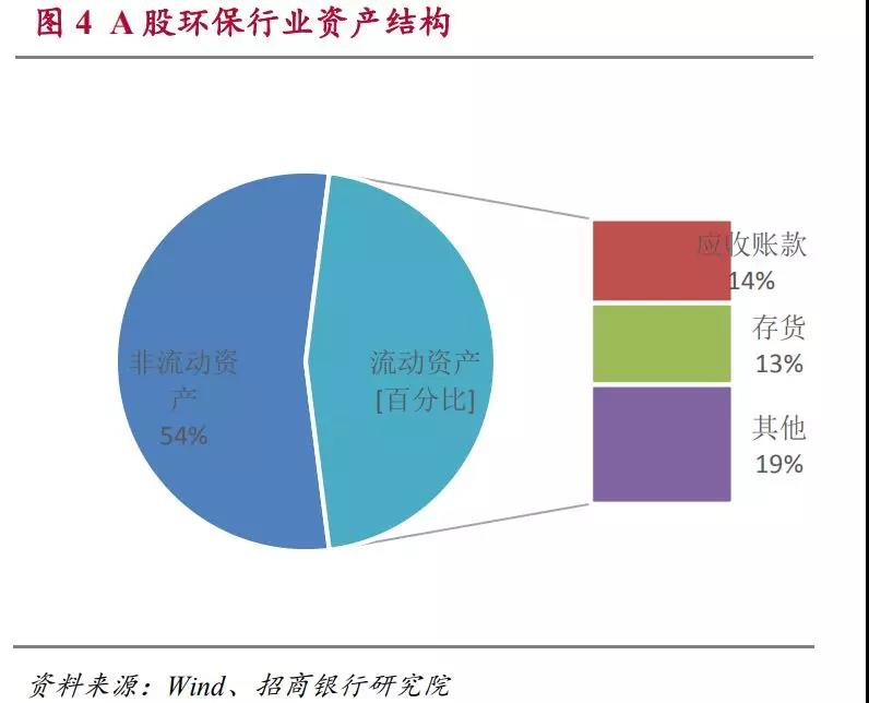 在環(huán)保類上市公司的資產(chǎn)結構中,非流動資產(chǎn)占比偏高,占到54%。而在46%的流動資產(chǎn)中,應收賬款和存貨的占比較高,這兩項分別占總資產(chǎn)的14%和13%。而其他流動資產(chǎn)合計僅占到總資產(chǎn)的19%。