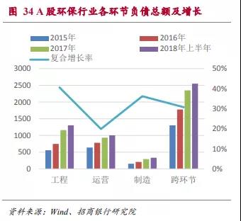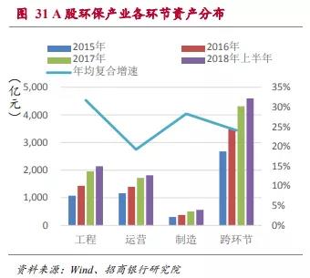 ■ 總資產(chǎn)規(guī)模占到A股上市公司的1.57%。截至2018年上半年,A股環(huán)保類上市公司資產(chǎn)總規(guī)模9124億,占A股總資產(chǎn)規(guī)模的1.57%。其中水體環(huán)保領域是最大的領域,其資產(chǎn)占所有環(huán)保行業(yè)A股上市公司總資產(chǎn)的41.44%,并以年均27%的復合增速增長。依托核心競爭力,縱向擴張成為A股環(huán)保類上市公司尋求增長點的主流模式,跨環(huán)節(jié)運營企業(yè)的資產(chǎn)規(guī)模占55%。