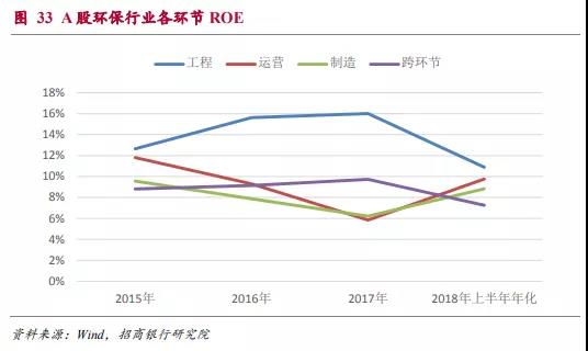 運營和跨環(huán)節(jié)經(jīng)營的公司凈利率水平明顯高于工程和制造環(huán)節(jié),其中運營環(huán)節(jié)歸母凈利率2018年上半年達到了17%的超高水平。而制造環(huán)節(jié)的歸母凈利率常年維持在低位,考慮到制造環(huán)節(jié)公司的非流動資產(chǎn)比例也較高,相應周轉率偏低,對應的ROE水平較低,可能是由于環(huán)保制造環(huán)節(jié)的進入壁壘不高所導致。