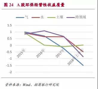導致自由現(xiàn)金流缺口較大的原因,除了行業(yè)高速擴張,投資金額大幅度擴大以外,經(jīng)營利潤質量的下滑也是重要因素之一。我們用經(jīng)營性現(xiàn)金流/(營業(yè)利潤-投資收益)這一比例來反映上市公司經(jīng)營性收益質量。圖24顯示三個領域這一指標都出現(xiàn)下滑,說明環(huán)保行業(yè)的收益質量在這三年里出現(xiàn)下降。