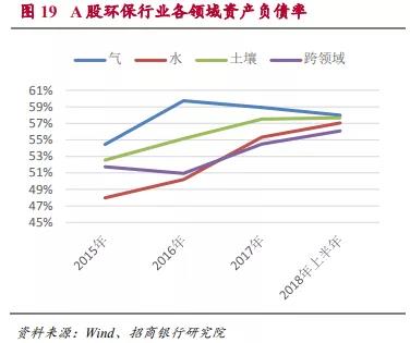 圖18顯示過去的3年里,在A股環(huán)保行業(yè)的各領域中,水體環(huán)保的負債上升速度最快,增速達到了30%以上。同時水體環(huán)保也因此從資產(chǎn)負債率最低的領域快速上升至與平均水平接近。目前4個領域的資產(chǎn)負債率有趨于一致的趨勢,都略低于60%。