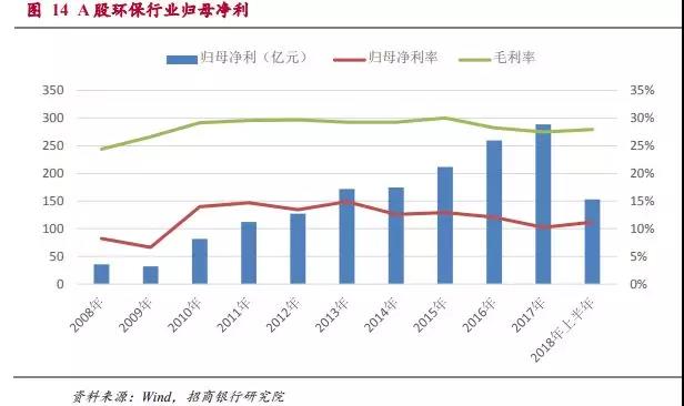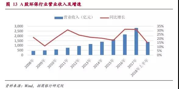 十年來,A股環(huán)保上市公司的營業(yè)收入經(jīng)歷了兩輪快速成長期,分別是09-11年和15-17年。這兩輪營收的高增長分別對應了大氣治理和污水處理的高投入期。由于污水處理的投資額可能遠遠高于大氣治理,時間跨度也會較長,所以我們判斷這一輪環(huán)保行業(yè)的高增長期可能會持續(xù)較長的時間。
