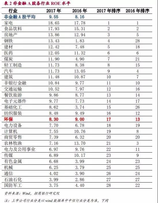 與A股其他行業(yè)相比較來看,環(huán)保行業(yè)ROE處于中游水平。2016年環(huán)保行業(yè)ROE為9.0%,處于28個行業(yè)中的第13位,明顯高于非金融A股的平均水平。而2017年環(huán)保行業(yè)ROE有所下滑,而周期行業(yè)的利潤出現(xiàn)了明顯的回升,使環(huán)保行業(yè)的ROE水平明顯低于非金融類A股的平均投資回報率,排序也下降到第17位。
