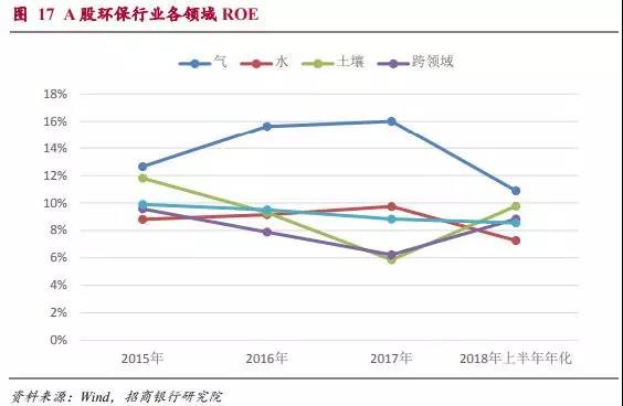 由于大氣環(huán)保在環(huán)保各領域中屬于輕資產(chǎn)的,所以其ROE水平一直屬于最高水平,但今年上半年出現(xiàn)明顯回落。同時水體環(huán)保作為環(huán)保領域資產(chǎn)占比最高的領域,ROE水平也是3年來首次出現(xiàn)回落。由于季節(jié)性原因,企業(yè)盈利存在上下半年的顯著差異;同時考慮到下半年貨幣政策有放松的可能,目前還無法斷定這兩個領域ROE下降趨勢是否已經(jīng)形成。