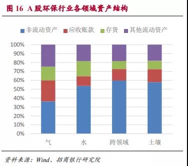 從各領域資產(chǎn)分布的情況來看,大氣領域的非流動資產(chǎn)占比最低,同時應收賬款的比例明顯偏高。這與大氣環(huán)保領域上市公司多數(shù)以工程和制造為主、運營偏少的業(yè)務模式有關。