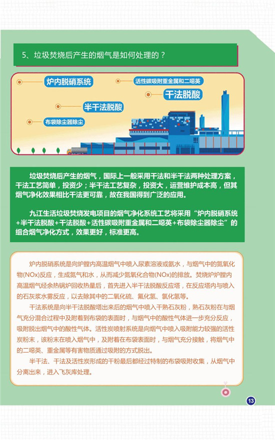 據(jù)介紹,九江垃圾焚燒發(fā)電項目煙氣凈化工藝采用“SNCR脫硝+半干法脫酸+干法脫酸+活性炭吸附+布袋除塵+煙氣再循環(huán)”的組合工藝技術(shù),達(dá)到并優(yōu)于歐盟2010標(biāo)準(zhǔn)。滲濾液和其他廢水處理達(dá)標(biāo)后全部廠內(nèi)回用。年供綠色電能3億度,節(jié)約標(biāo)準(zhǔn)煤12萬噸/年,二氧化碳減排2.5萬噸/年,COD減排1.5萬噸/年。