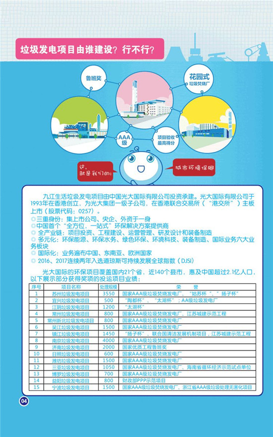 同杭州九峰垃圾焚燒發(fā)電項目一樣,九江垃圾焚燒發(fā)電項目也將由中國光大國際有限公司投資、建設(shè)、運(yùn)營。據(jù)了解,光大國際在全國各地先后投資、建設(shè)、運(yùn)營99個項目,日處理生活垃圾規(guī)模超過8萬噸,成為國內(nèi)垃圾焚燒發(fā)電行業(yè)領(lǐng)頭羊。光大國際所投資建設(shè)的垃圾發(fā)電項目均采用機(jī)械爐排爐工藝,煙氣排放執(zhí)行最為嚴(yán)格的歐盟2010標(biāo)準(zhǔn),煙氣監(jiān)測系統(tǒng)與當(dāng)?shù)丨h(huán)保部門在線聯(lián)網(wǎng),各種排放指標(biāo)向社會及時公布。垃圾滲濾液的綜合處理開創(chuàng)了國內(nèi)“先河”,以一個個環(huán)境優(yōu)美的花園式垃圾焚燒發(fā)電項目,向社會、居民、各地政府鄭重兌現(xiàn)了承諾。