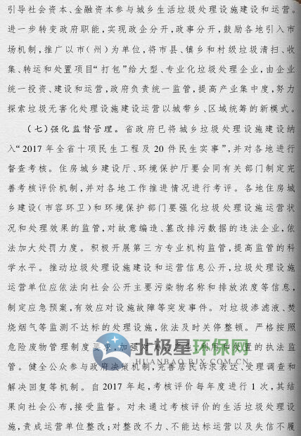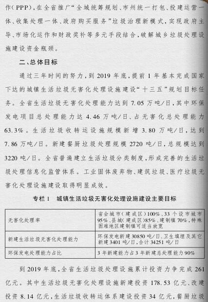 《方案》提出,要根據(jù)人口聚集程度、自然地理?xiàng)l件、經(jīng)濟(jì)發(fā)展水平等情況統(tǒng)籌規(guī)劃布局垃圾處理設(shè)施建設(shè);要補(bǔ)齊垃圾處理設(shè)施建設(shè)短板,到2019年底,新建生活垃圾無(wú)害化處理設(shè)施76座,完成無(wú)害化處理設(shè)施改擴(kuò)建43個(gè)和存量垃圾治理項(xiàng)目62個(gè)。