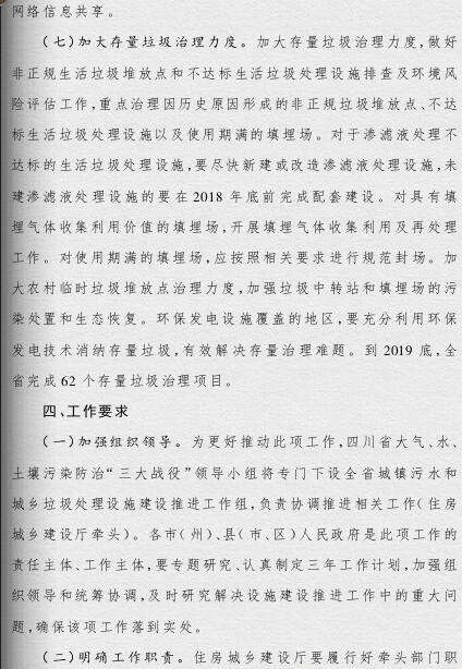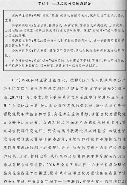 四川省政府印發(fā)了《四川省城鄉(xiāng)垃圾處理設(shè)施建設(shè)三年推進(jìn)方案》(以下簡(jiǎn)稱(chēng)《方案》)?!斗桨浮诽岢?,到2019年底,我省生活垃圾無(wú)害化處理能力將達(dá)7.05萬(wàn)噸/日,生活垃圾處理設(shè)施累計(jì)投資力爭(zhēng)完成361億元,普遍建立生活垃圾分類(lèi)制度,形成完善的生活垃圾處理信息化監(jiān)管體系。