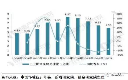 圖表:2008-2017年中國(guó)工業(yè)固體廢物處置量及增長(zhǎng)情況