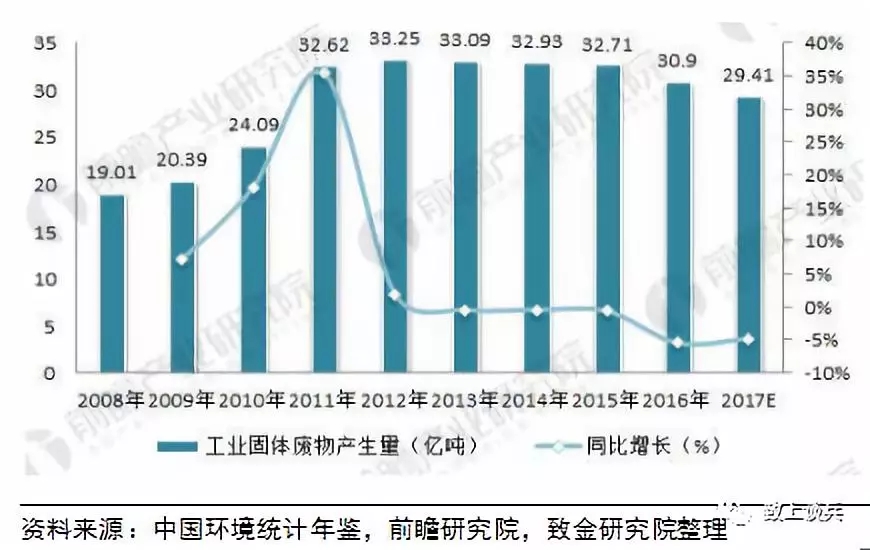 圖表:2008-2017年中國(guó)工業(yè)固體廢物產(chǎn)生量及增長(zhǎng)情況