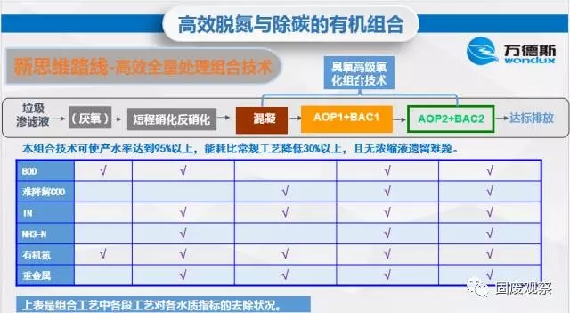 南京萬德斯環(huán)??萍脊煞萦邢薰旧虾7止究偨?jīng)理陳建湧介紹,在滲瀝液脫碳技術(shù)上,萬德斯環(huán)保采用“厭氧+高效生化+納濾+臭氧高級氧化AOP(Advanced Oxidation Process)” 為主的工藝,在高效脫氮中,利用短程硝化技術(shù),節(jié)省供氧量25%、節(jié)省反硝化碳源40%、減少污泥生成量50%、減少投堿量、縮短反應時間。在滲瀝液高效全量處理中,組合利用 “厭氧+短程硝化反硝化+臭氧高級氧化(混凝+AOP1+BAC1+AOP2+BAC2)”技術(shù),能使產(chǎn)水率達到95%以上,且無濃縮液遺留難題。除技術(shù)創(chuàng)新外,陳建湧總經(jīng)理認為,提倡垃圾干濕分類,采取各種有效措施減少各種好水分包括雨水進入垃圾,以及垃圾堆場等,對降低滲瀝液處理成本具有非常重要的意義。